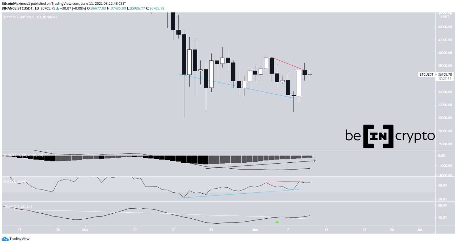 O Bitcoin está em alta desde terça-feira (8), após atingir a mínima de US$ 31.000. A moeda criou um engolfo de alta na quarta-feira (9) e atingiu um topo de US$ 38.491 no dia seguinte.