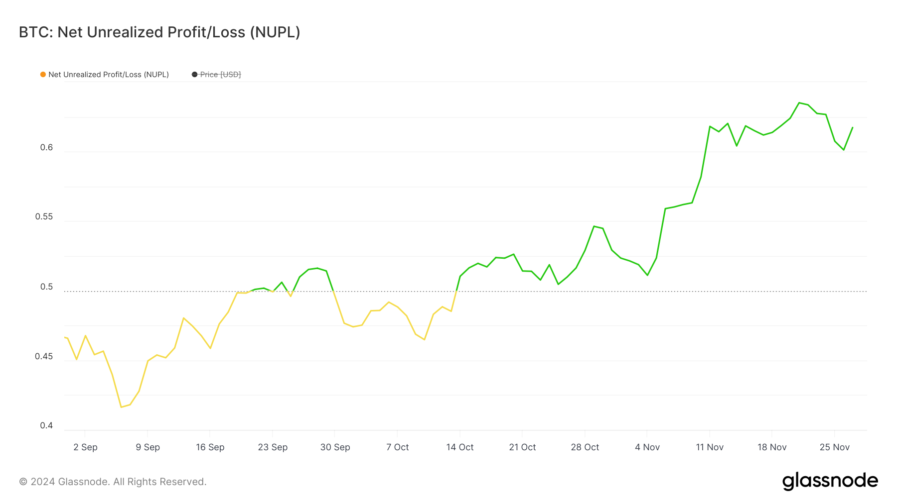 O BTC NUPL, ou Lucro/Prejuízo Não Realizado Líquido, atualmente está em 0,61, posicionando-se na zona de “Crença — Negação” desde 14 de outubro. O NUPL avalia a proporção de lucros não realizados em relação às perdas, fornecendo uma visão sobre o sentimento do mercado.