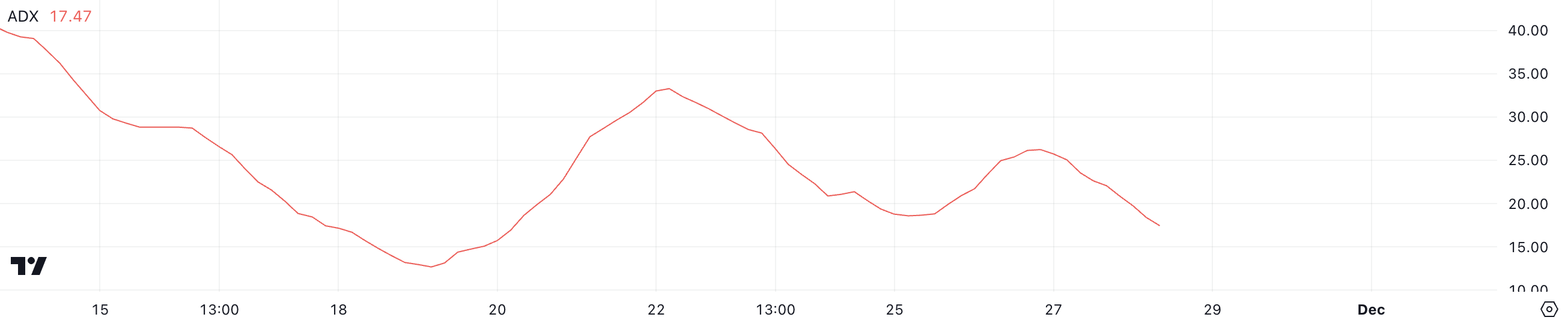 O Bitcoin ADX, atualmente em 17,4, reflete uma tendência de enfraquecimento em comparação com seu valor de 26 há apenas dois dias. O ADX, ou Índice Direcional Médio, mede a força de uma tendência em uma escala de 0 a 100, sem indicar sua direção. Valores acima de 25 indicam uma tendência forte, enquanto valores abaixo de 20 indicam tendência fraca ou inexistente.