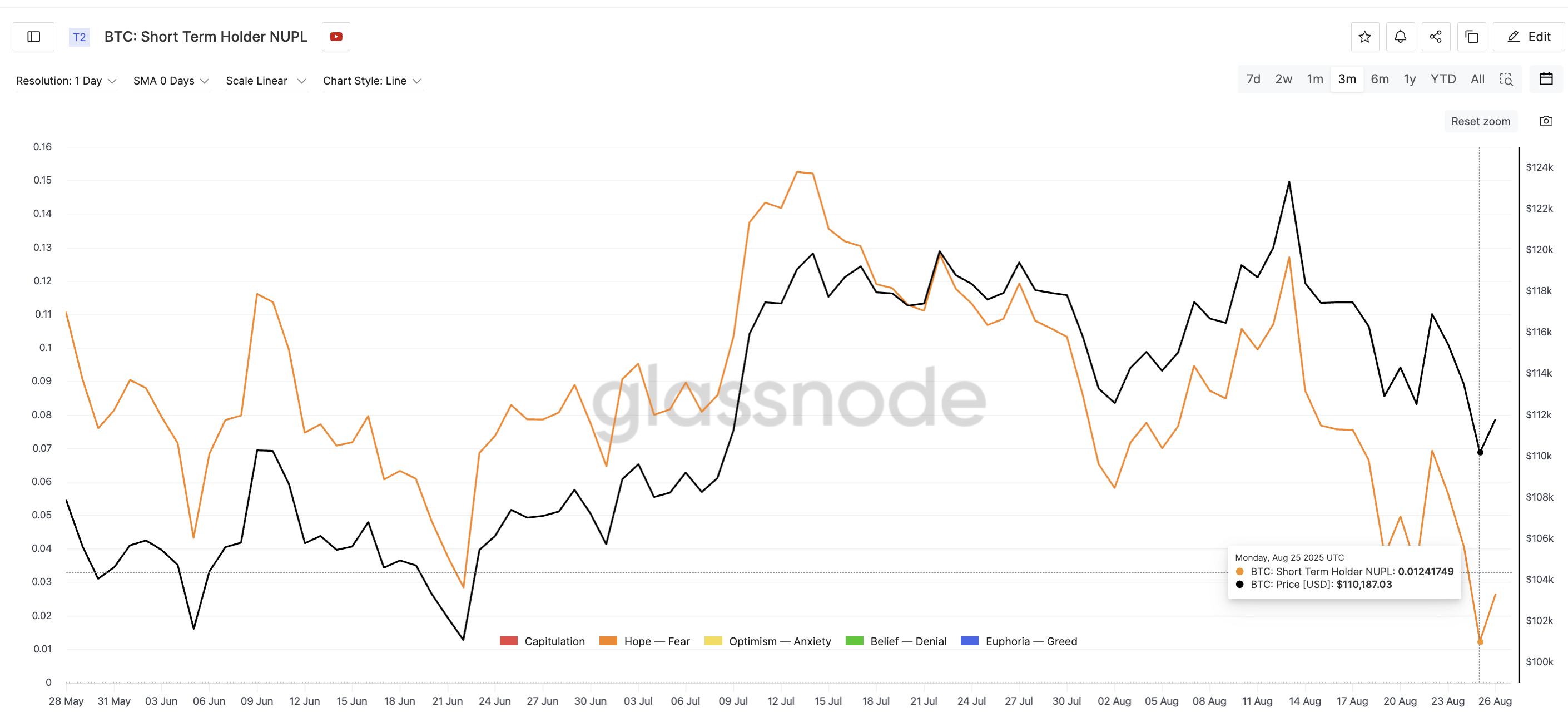 O NUPL dos investidores de curto prazo caiu quase 90% em pouco mais de 40 dias. Ele caiu de um máximo de 0,152 em meados de julho para um mínimo de 0,012 em 25 de agosto, seu nível mais baixo em três meses. Desde então, subiu ligeiramente para 0,026, mas ainda permanece próximo do fundo.