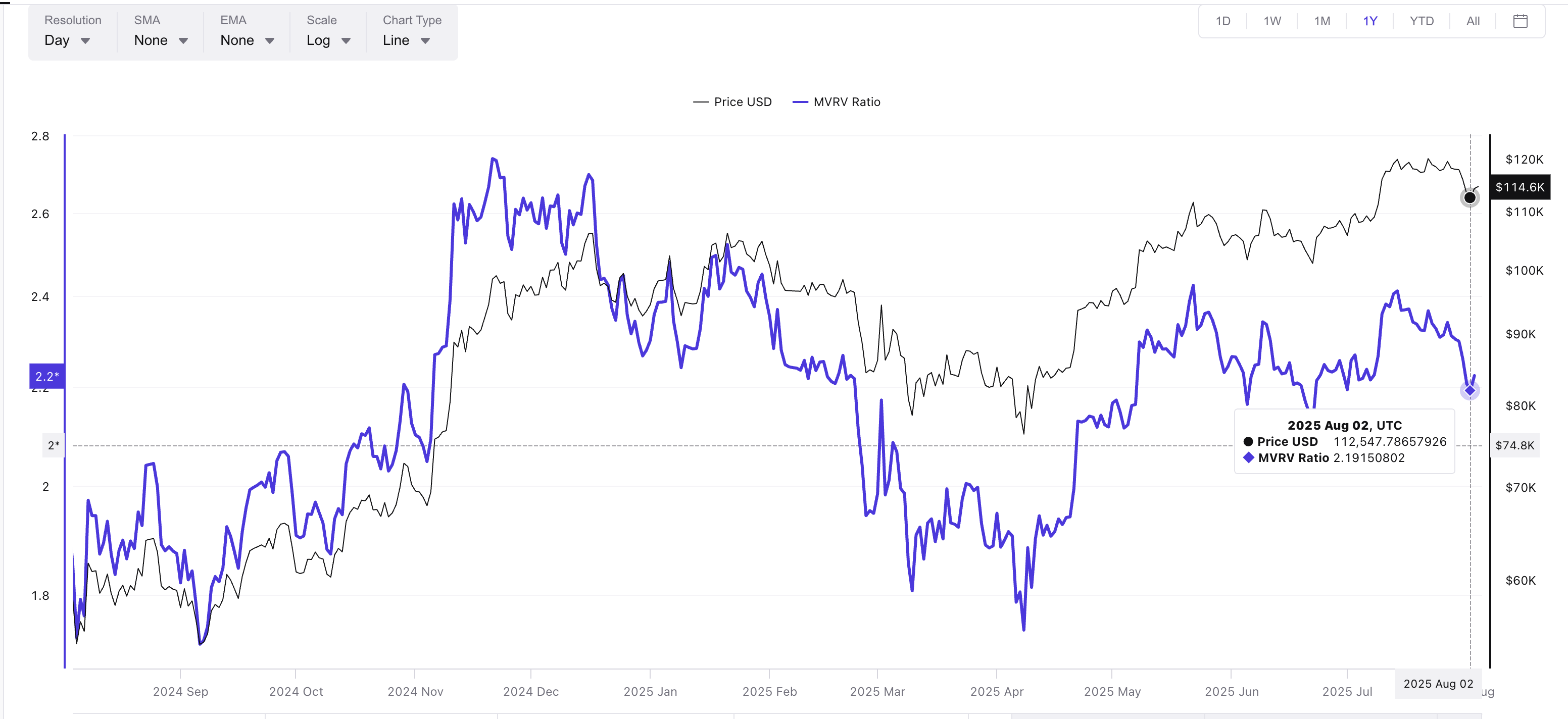 Em junho de 2025, quando atingiu 2,16, o preço do Bitcoin saltou de US$ 101 mil para US$ 110 mil em seis dias. Em abril, 2,12 levou a um movimento de US$ 101 mil para US$ 119 mil. E em novembro de 2024, 2,04 desencadeou um rali de US$ 67 mil para US$ 98 mil.