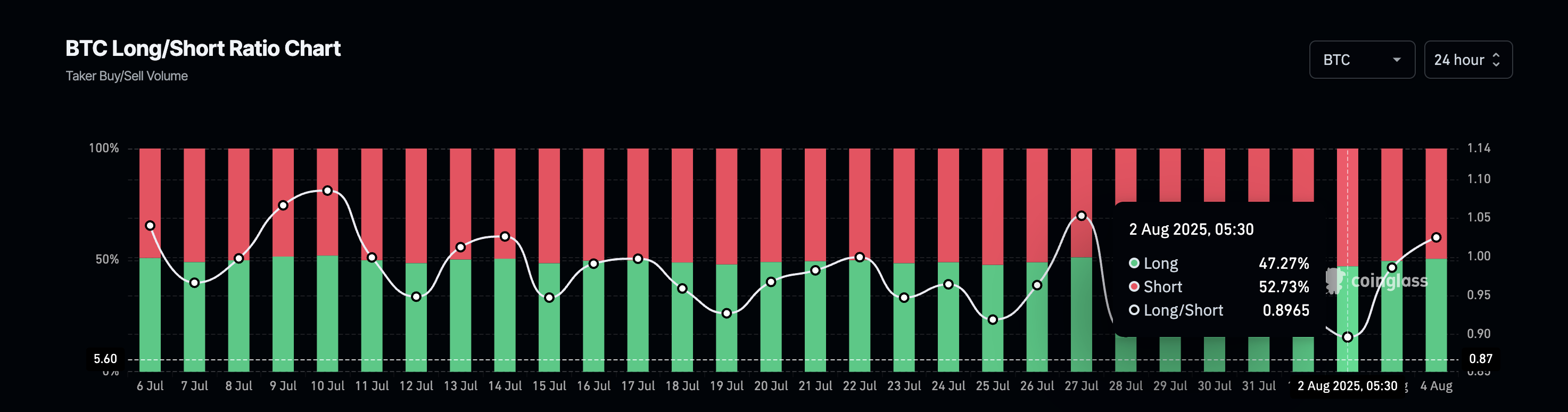 Até mesmo o posicionamento dos traders está mudando na mesma direção. A relação long/short, que estava em 0,89 há apenas dois dias, agora virou para 1,02. É uma mudança sutil, mas confirma que mais traders estão se posicionando para a alta, assim como os sinais de valorização indicam que há espaço para crescer.