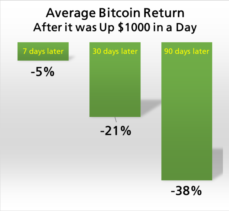 Como Timothy Peterson , CFA da Cane Island Alternative Advisors, apontou através do Twitter , houve apenas 13 outras ocasiões em que o preço do BTC aumentou em mais de US $ 1.000 em uma única sessão de 24 horas. Em média, perdas substanciais ocorreram nas semanas e meses seguintes.