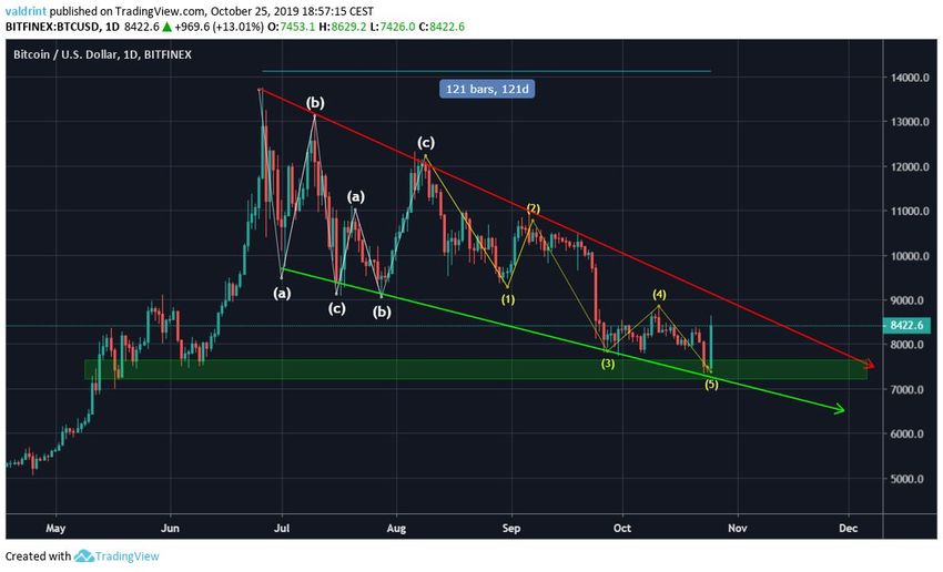 O final da quinta onda estava em convergência entre a linha de apoio e uma área de apoio. Assim que o preço do Bitcoin terminou a correção, sinalizou o início de uma nova tendência ascendente com a alta de hoje.