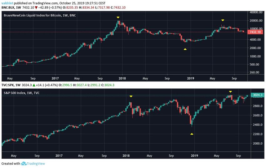 Desde 2016, o preço do Bitcoin realmente teve uma correlação positiva com o desempenho do S&P 500. Ambos atingiram uma alta perto de dezembro de 2017, antes de diminuir. A baixa de US $ 3140 em dezembro de 2018 coincidiu perfeitamente com a do S&P500 – e a recente alta de US $ 13.764 em julho de 2019.