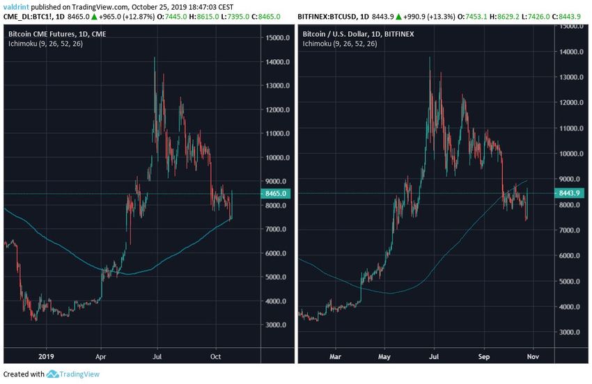 Uma razão para isso é a presença de gaps. Como a MA de 200 dias é criada por uma média móvel do preço dos 200 candles mais recentes, a presença de lacunas distorceu ligeiramente essa média. A MA de 200 dias no gráfico CME (US $ 7400) e no gráfico Bitfinex (US $ 9000) é fornecida abaixo.