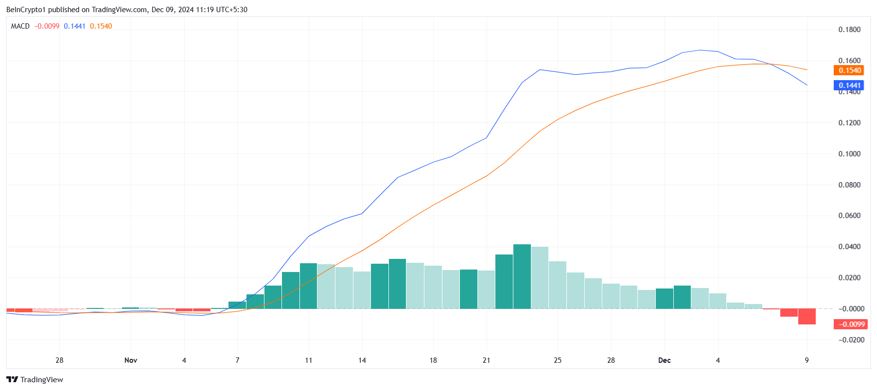 O momento macro da Cardano também mudou para baixo, conforme indicado por indicadores técnicos. O MACD (Moving Average Convergence Divergence) mostrou um cruzamento de baixa no fim de semana. Isso sinaliza que a ADA pode enfrentar uma possível queda no curto prazo.