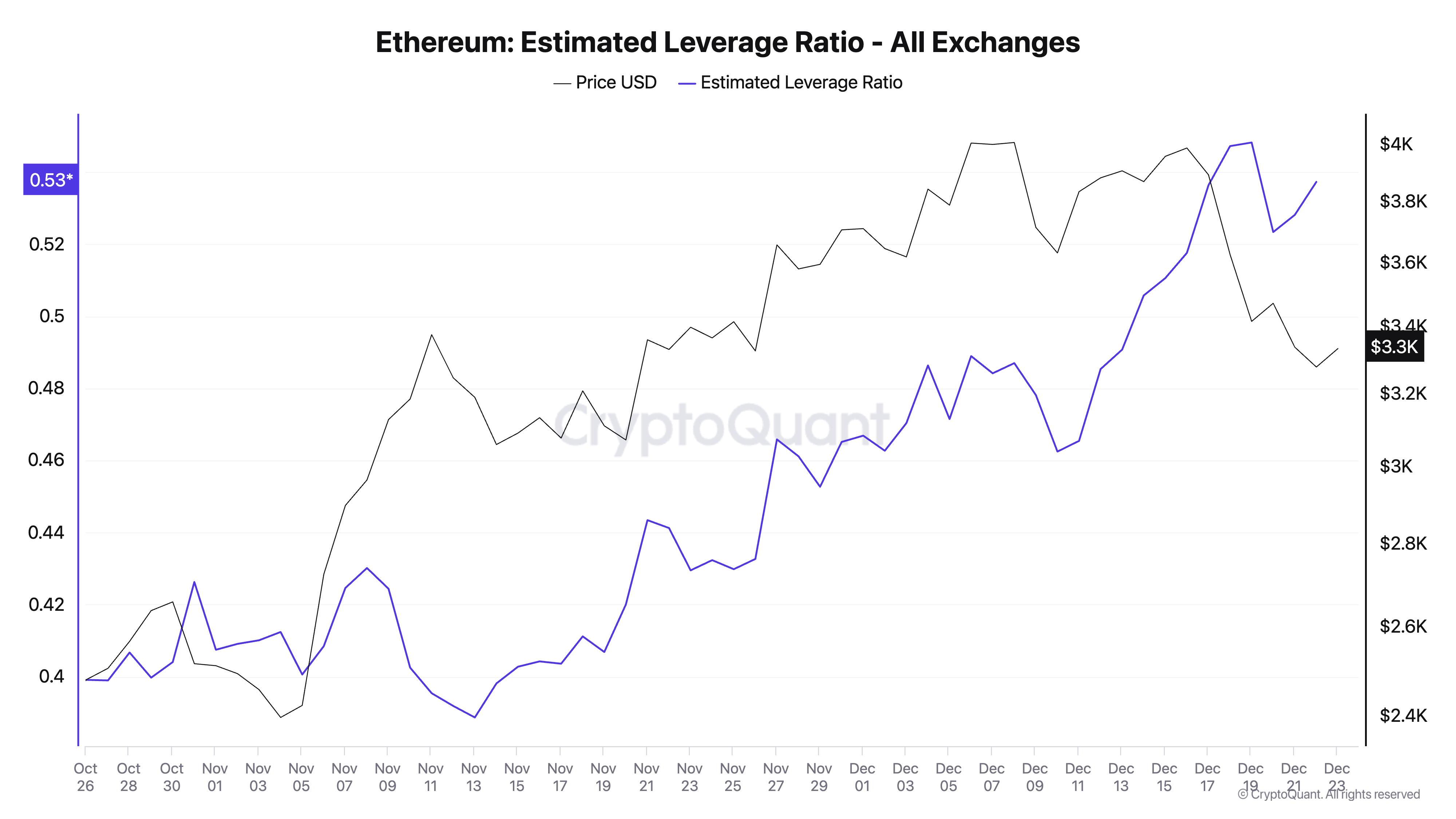 Primeiro, o aumento do Estimated Leverage Ratio (ELR) do Ethereum indica um apetite sustentado por risco, refletindo a probabilidade de uma recuperação de preço. De acordo com a CryptoQuant, o indicador está em 0,53 atualmente.
