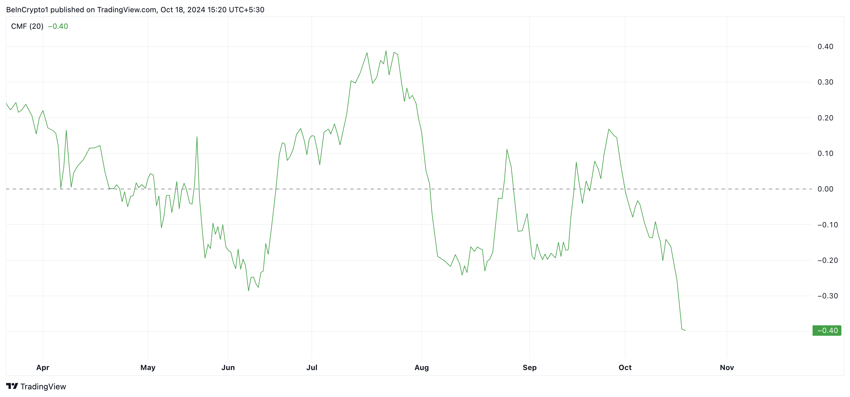 Contudo, essa nova demanda tem faltado no mercado do MKR há várias semanas, como evidenciado por sua queda no Fluxo de Dinheiro Chaikin (CMF). Em resumo, esse indicador mede como o dinheiro flui para dentro e fora de um ativo. Atualmente o CFM do MKR está em -0,40, o mais baixo desde agosto de 2022.