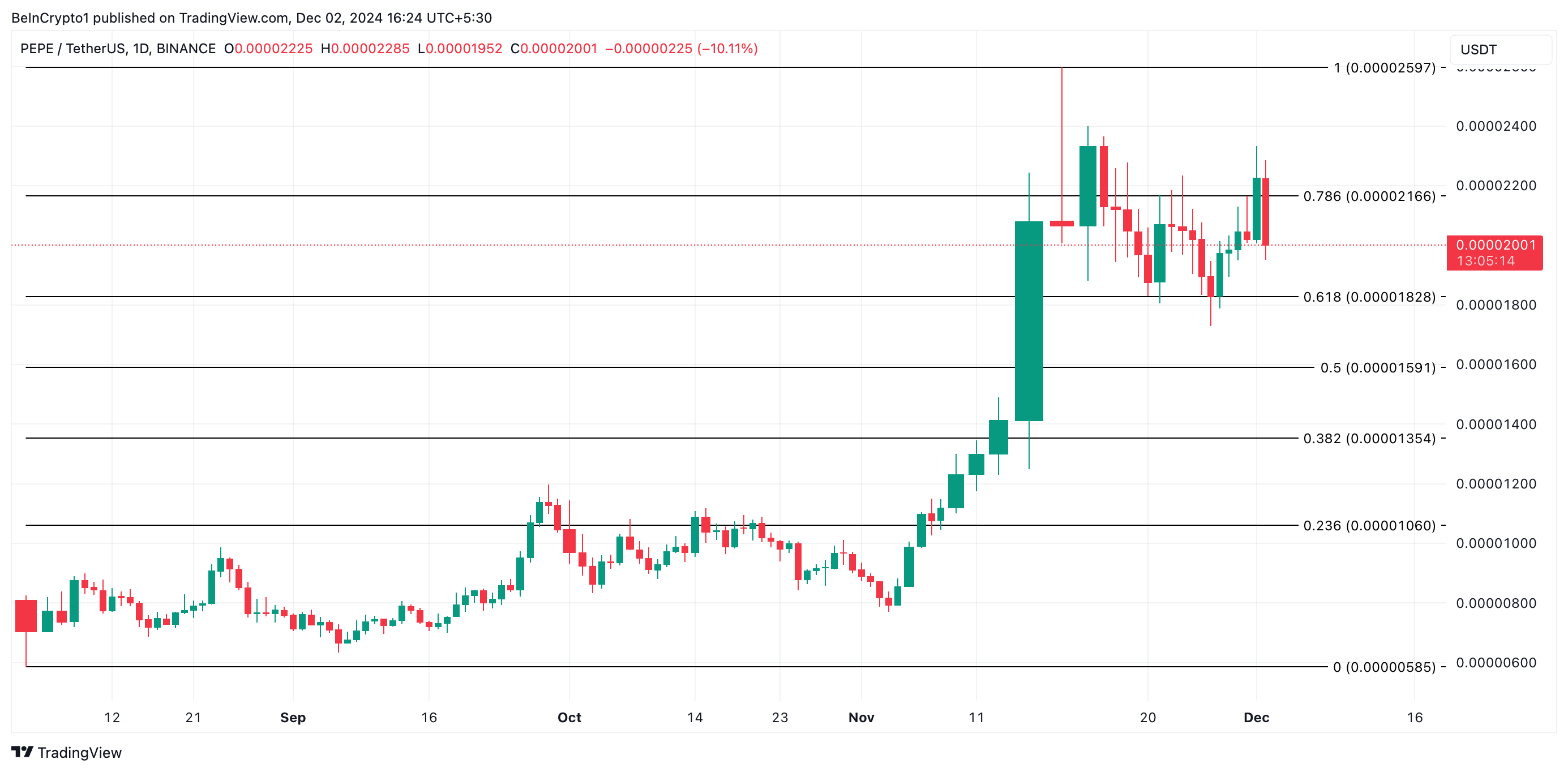 A popular memecoin Pepe (PEPE) atingiu um recorde histórico de US$ 0,000025 em 14 de novembro, mas desde então caiu 20% devido ao aumento na realização de lucros.