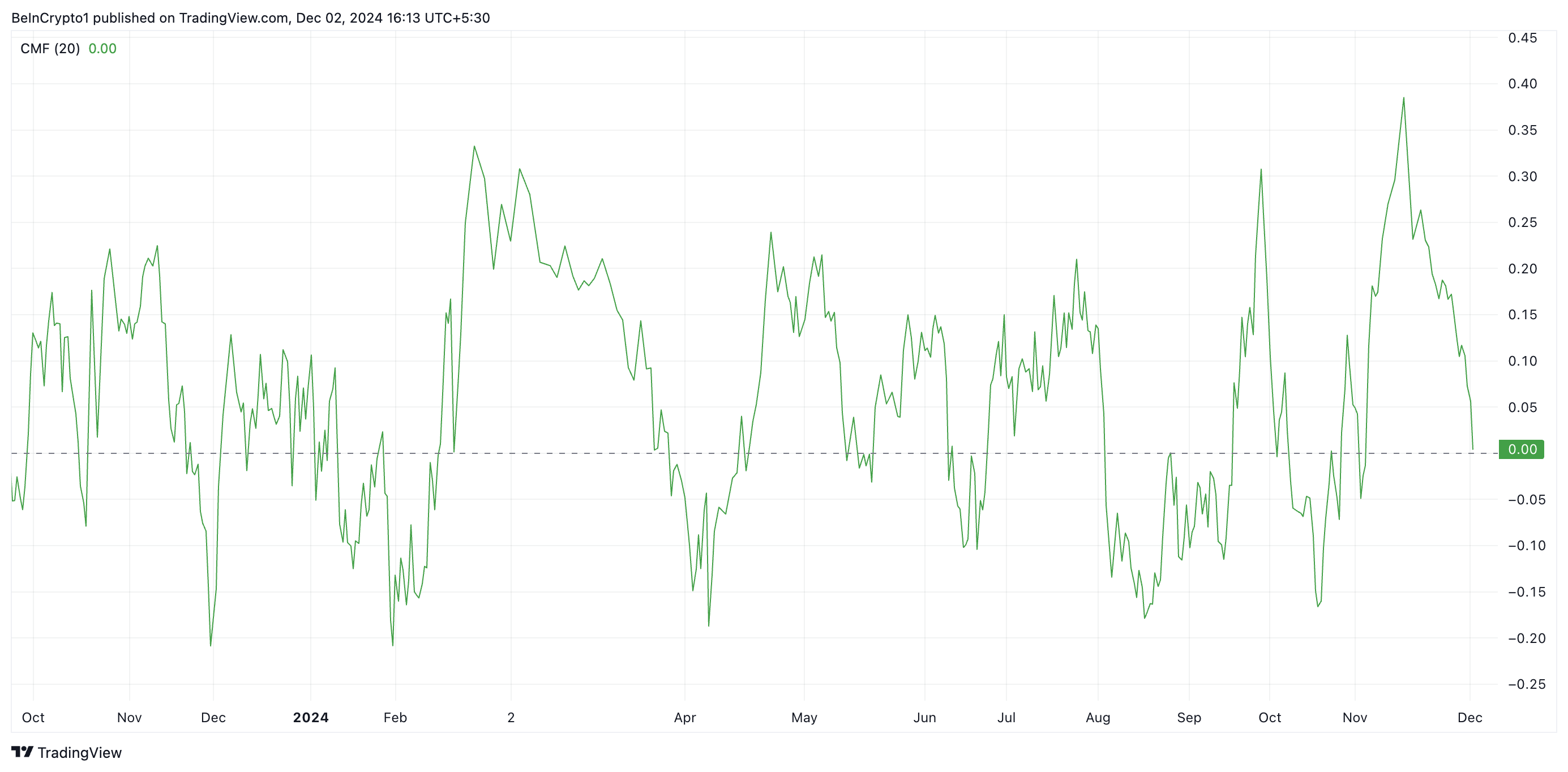 No gráfico diário PEPE/US$, o Chaikin Money Flow (CMF) da altcoin está prestes a cruzar a linha zero. Na verdade, este indicador de momento está na linha central.