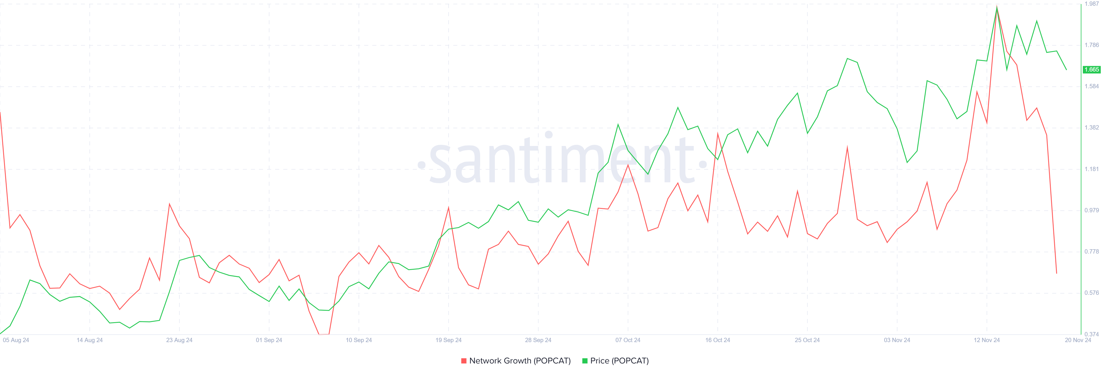 O preço da POPCAT caiu significativamente de sua máxima histórica (ATH) de US$ 2,10, atualmente sendo negociado a US$ 1,65. Este declínio fez com que a memecoin caísse abaixo do nível crítico de suporte de US$ 1,74, um marcador chave para manter o impulso ascendente.