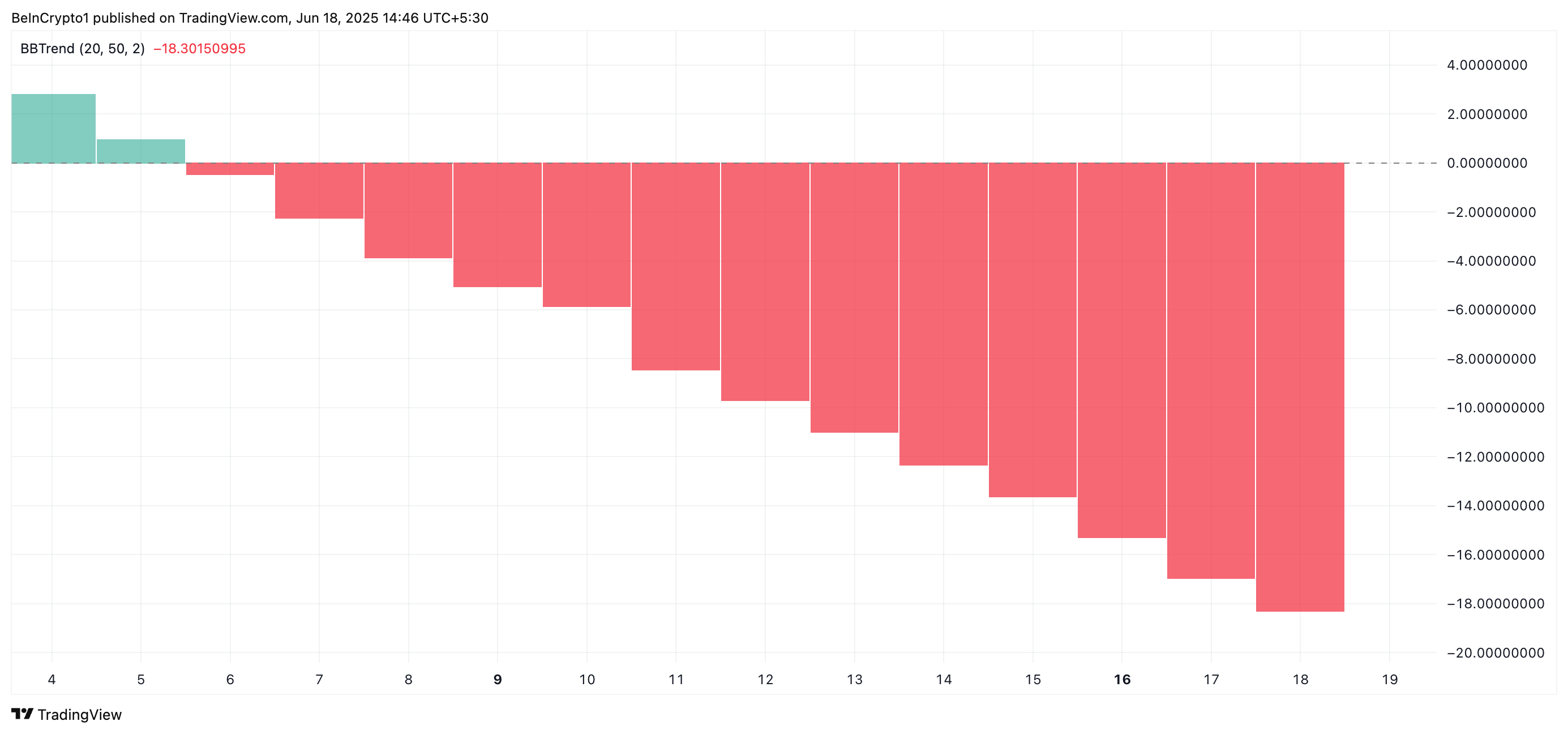 O BBTrend, indicador que avalia a força e a direção de uma tendência com base na expansão e contração das Bandas de Bollinger, reforça o cenário de baixa. Quando o BBTrend apresenta valores positivos, indica uma tendência de alta; já os valores negativos sugerem aumento da pressão vendedora.