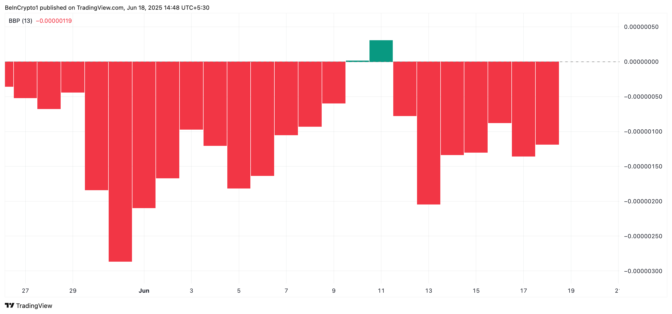 Além disso, o Índice Elder-Ray da memecoin reforça essa perspectiva negativa. No momento desta reportagem, o indicador registra -0,0000011, permanecendo abaixo de zero e sinalizando o predomínio da força de venda sobre a compra.