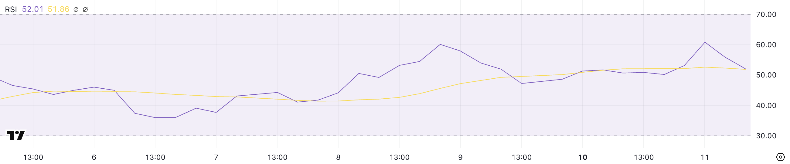 O RSI da Shiba Inu está atualmente em 52 após um movimento acentuado ontem (10) que o fez subir de 50 para 60,8. O Índice de Força Relativa (RSI) é um indicador de momento usado para medir se um ativo está sobrecomprado ou sobrevendido.