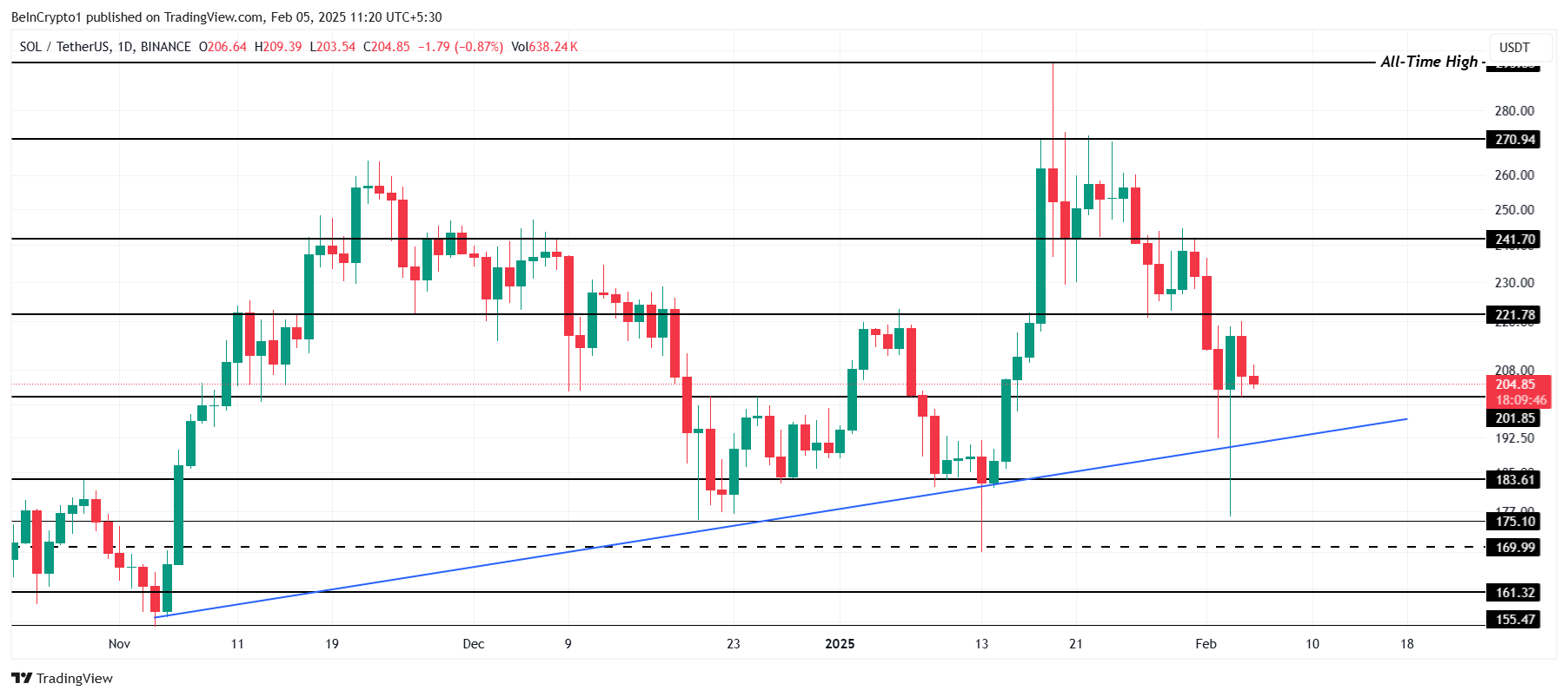 O preço da Solana está atualmente em US$ 204, mantendo suporte acima de US$ 201, apesar de um declínio consistente nos últimos dias. A incapacidade da altcoin de romper a resistência de US$ 270 nos últimos meses a deixou vulnerável a riscos de queda. O nível de suporte de US$ 201 será crítico para determinar seu próximo movimento.