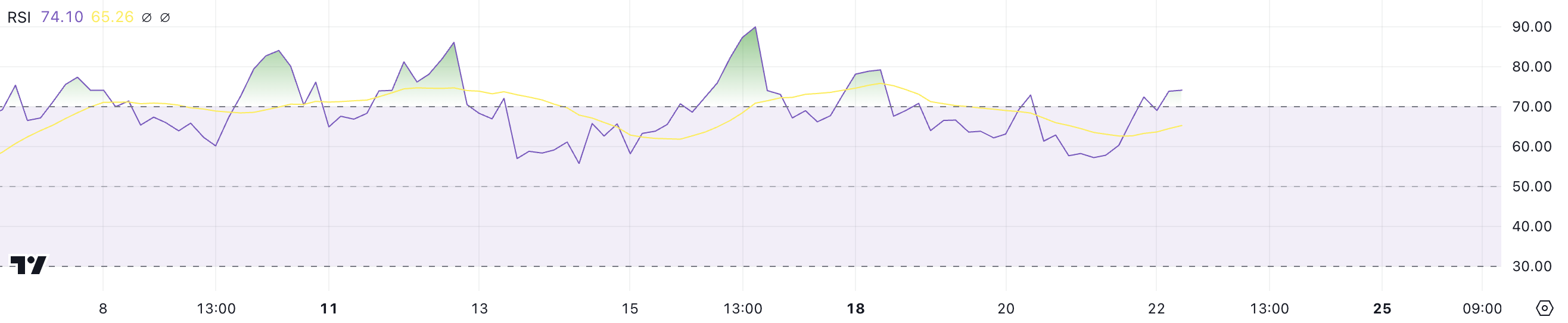 O RSI avalia a força dos movimentos de preço, com valores acima de 70 indicando sobrecompra e abaixo de 30, sobrevenda. A Stellar já teve RSI acima de 70 por dias, com preços subindo antes de corrigirem.