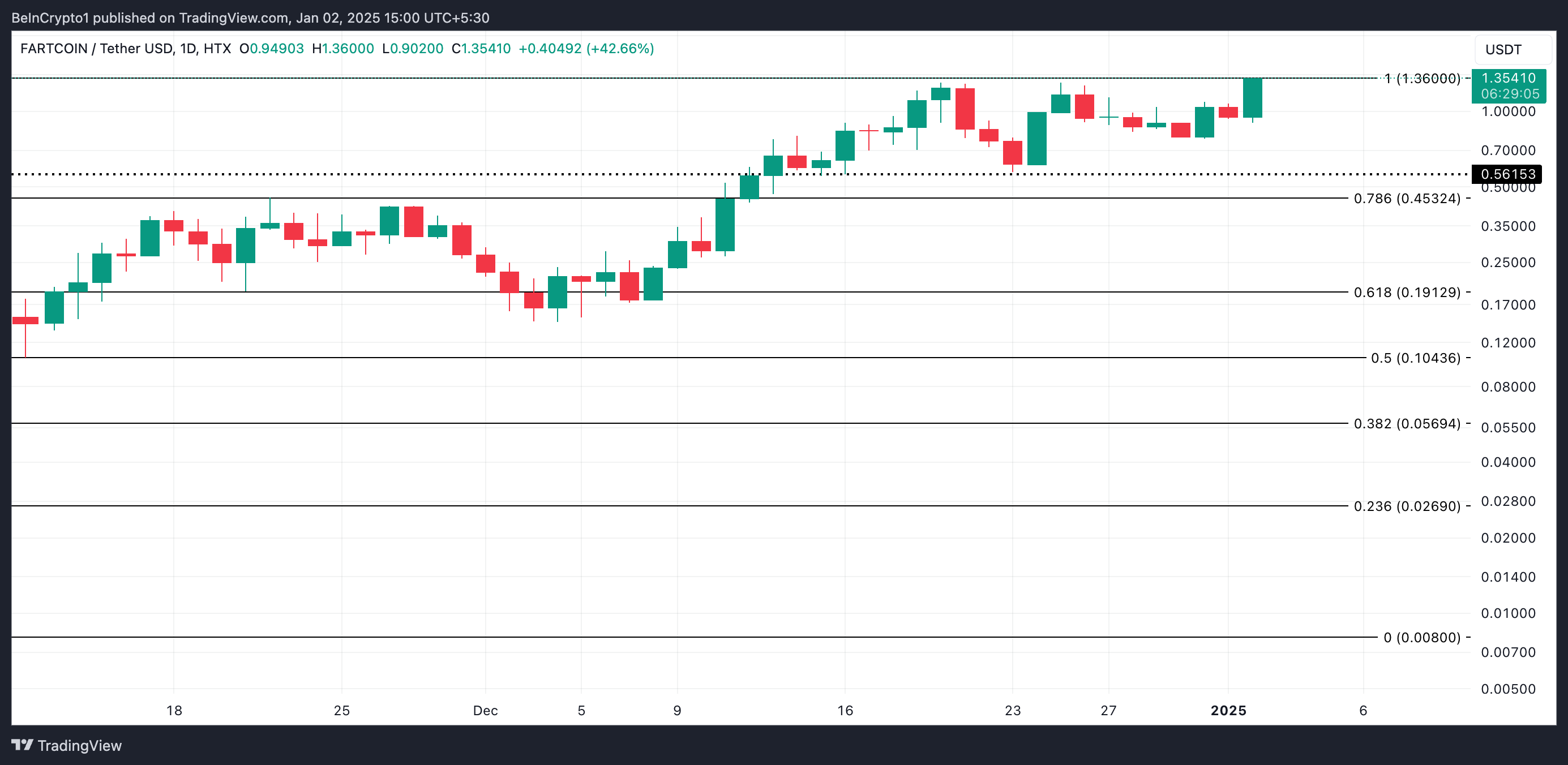Se esse nível de suporte não se mantiver, o preço pode cair ainda mais para US$ 0,44. Por outro lado, se a tendência de alta persistir, a FARTCOIN pode subir para uma nova ATH.