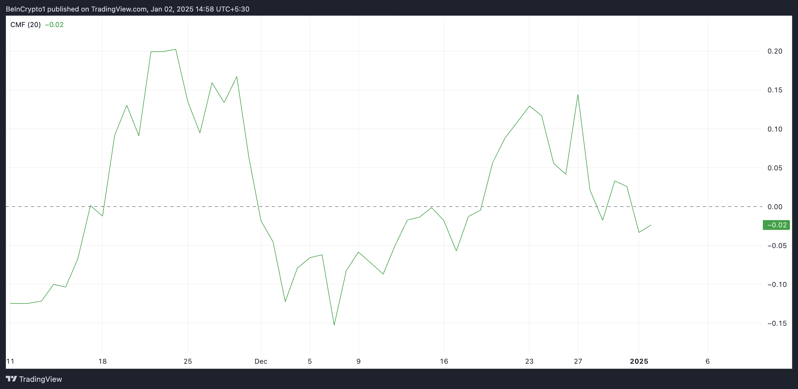 Na verdade, a memecoin tem um Chaikin Money Flow (CMF) negativo que confirma que a atividade de venda já está em andamento, enquanto traders aproveitam a alta de preços. No fechamento da matéria, a métrica estava em -0,02.