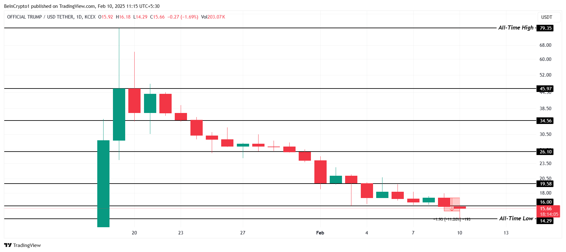 O preço da TRUMP atingiu uma nova mínima histórica (ATL) de US$ 14,29 hoje (10), marcando uma queda de 11% nas últimas 24 horas. A forte queda foi desencadeada pela perda de US$ 16,00 como suporte, que atuava como um nível crucial para manter a estabilidade. Sem uma recuperação rápida, mais quedas permanecem possíveis.
