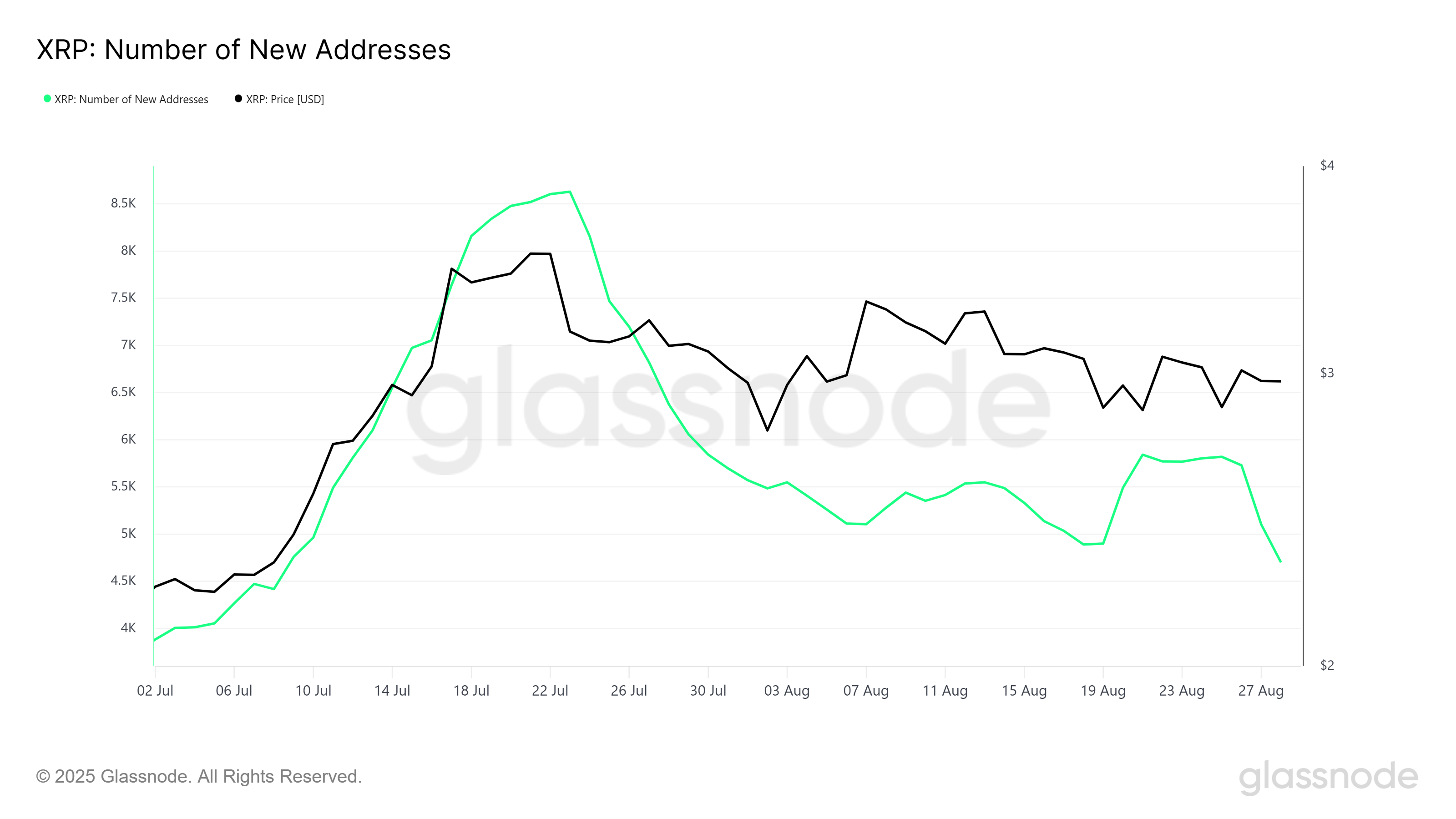 Dados da rede destacam o interesse decrescente de novos participantes. O número de novos endereços, medido por transações pela primeira vez, caiu para perto de uma baixa de dois meses. Essa desaceleração sinaliza atividade reduzida de novos investidores, limitando o influxo de novo capital em XRP e contribuindo para a estagnação contínua do ativo.
