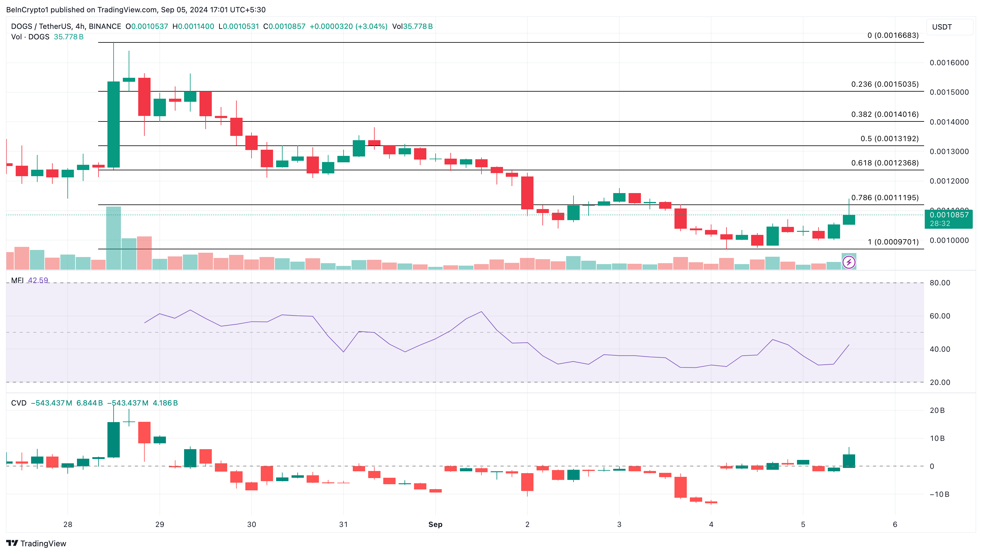 Uma análise do gráfico de 4 horas DOGS/USDT mostra um aumento significativo no Delta de Volume Cumulativo (CVD), um indicador técnico que mede a diferença entre o volume de compra e venda, oferecendo insights sobre a dinâmica de oferta e demanda do mercado.