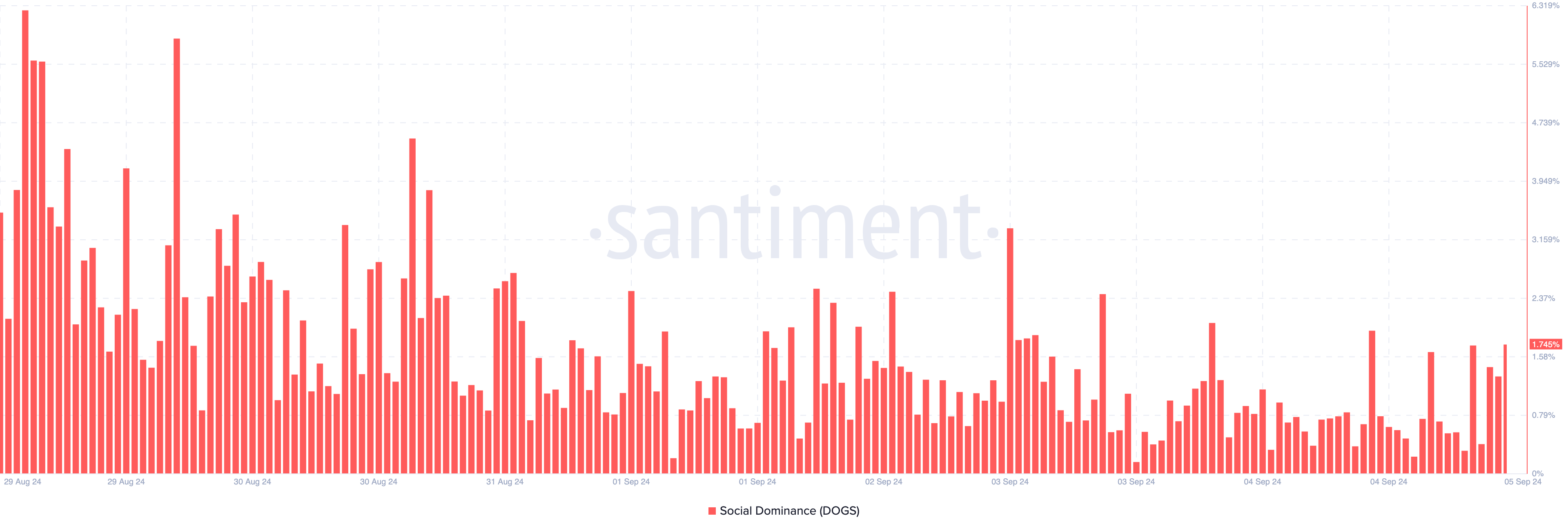 Após esse desenvolvimento, dados on-chain da Santiment revelaram um aumento na dominância social do DOGS. Em cripto, aliás, a dominância social mede a frequência com que um projeto é discutido no mercado.