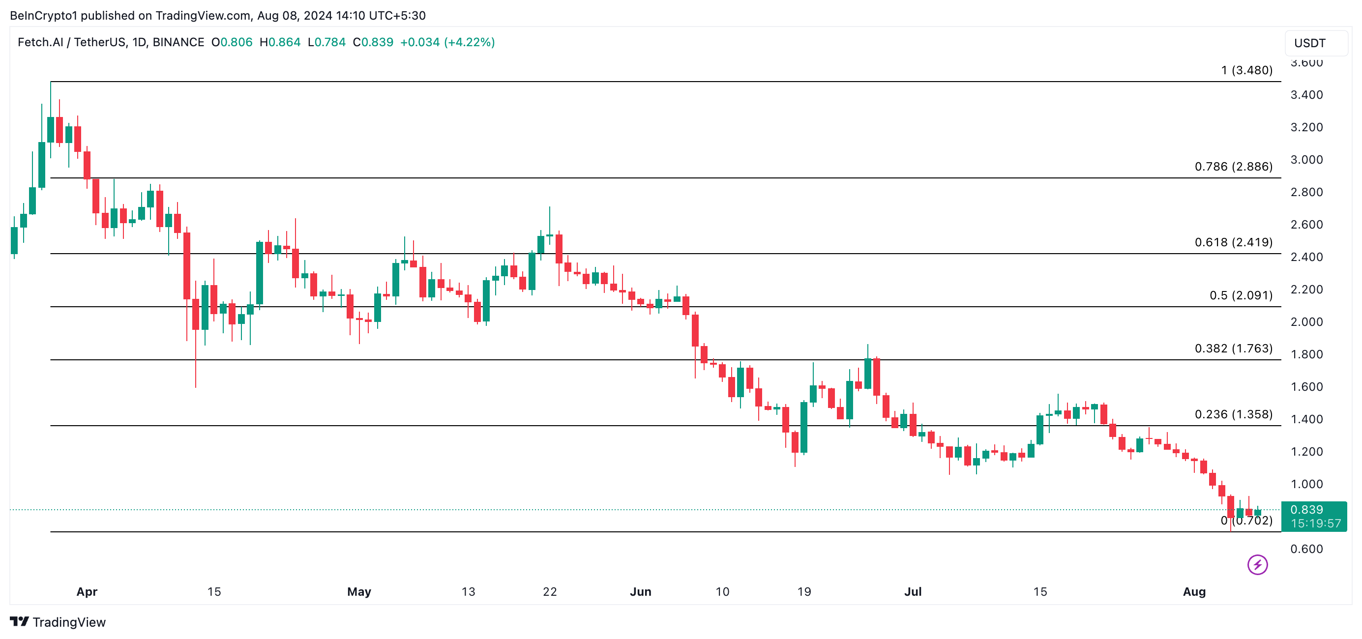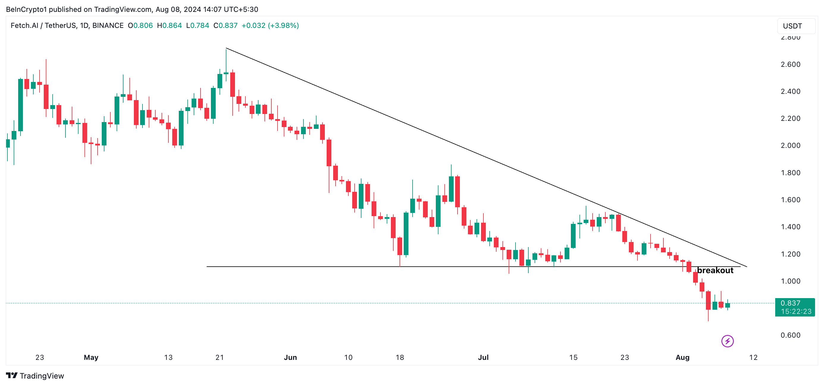 O valor da Artificial Superintelligence Alliance (FET) está em uma queda consistentemente desde maio. O preço da altcoin tinha uma tendência dentro de um canal descendente, que se quebrou no dia 3 de agosto.