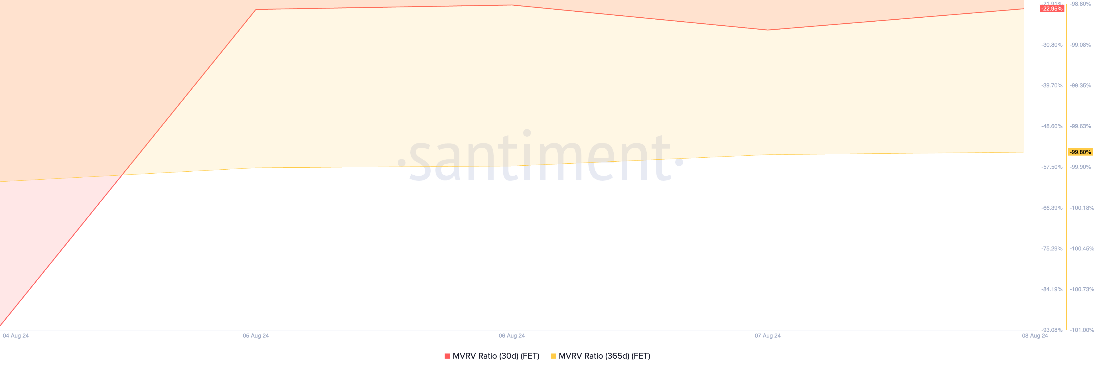 Os índices de valor de mercado para valor realizado (MVRV) da FET, avaliados em diferentes médias móveis, emitiram sinais de compra para os traders que buscam comprar as baixas. De acordo com a Santiment, os índices MVRV de 30 e 365 dias do token são -22,95 e -99,80, respectivamente.