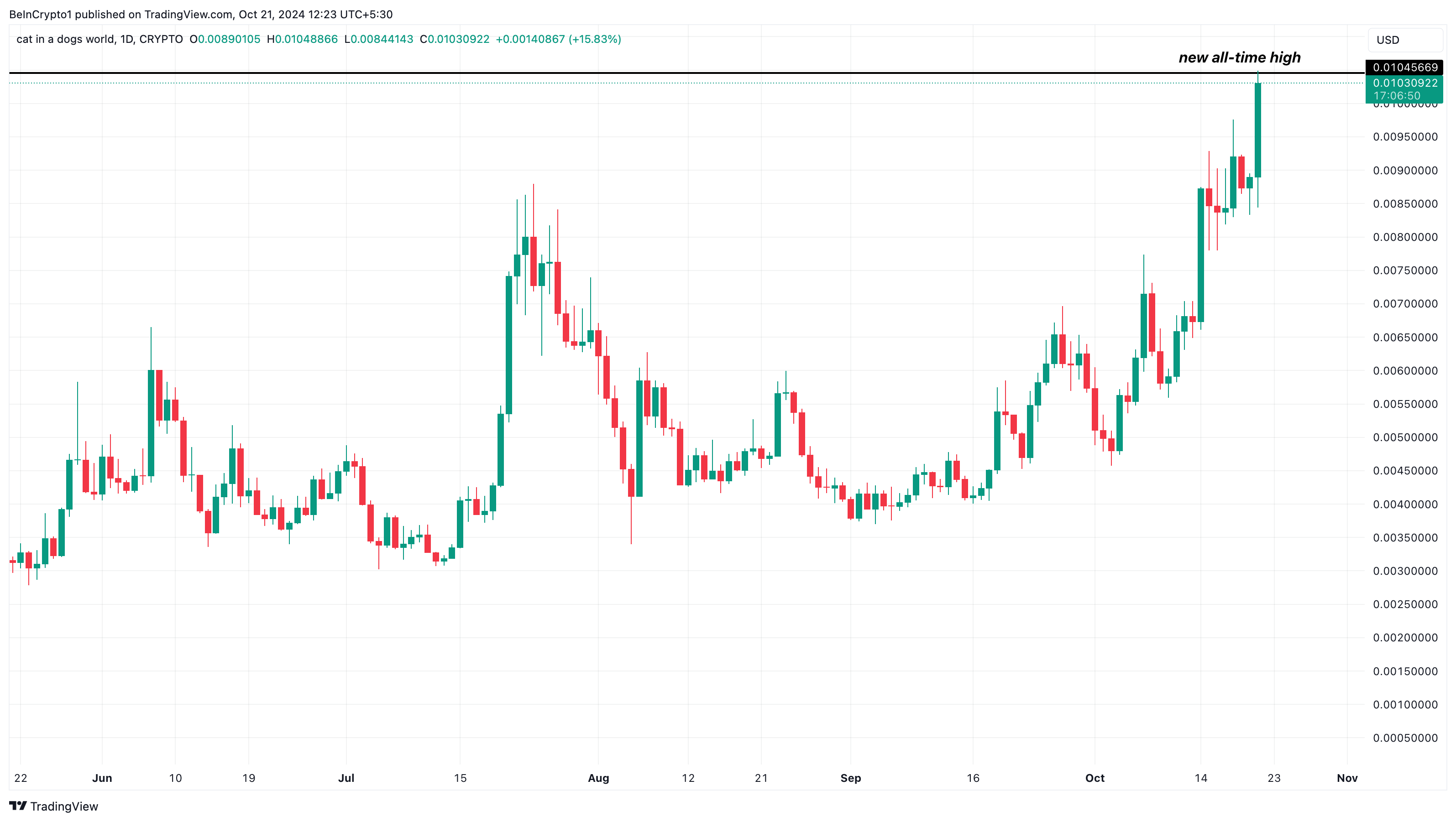 O recorde anterior de preço da MEW foi de US$ 0,0097 atingindo no mês de março. Mas hoje, a explosão de alta levou o preço acima dessa marca.