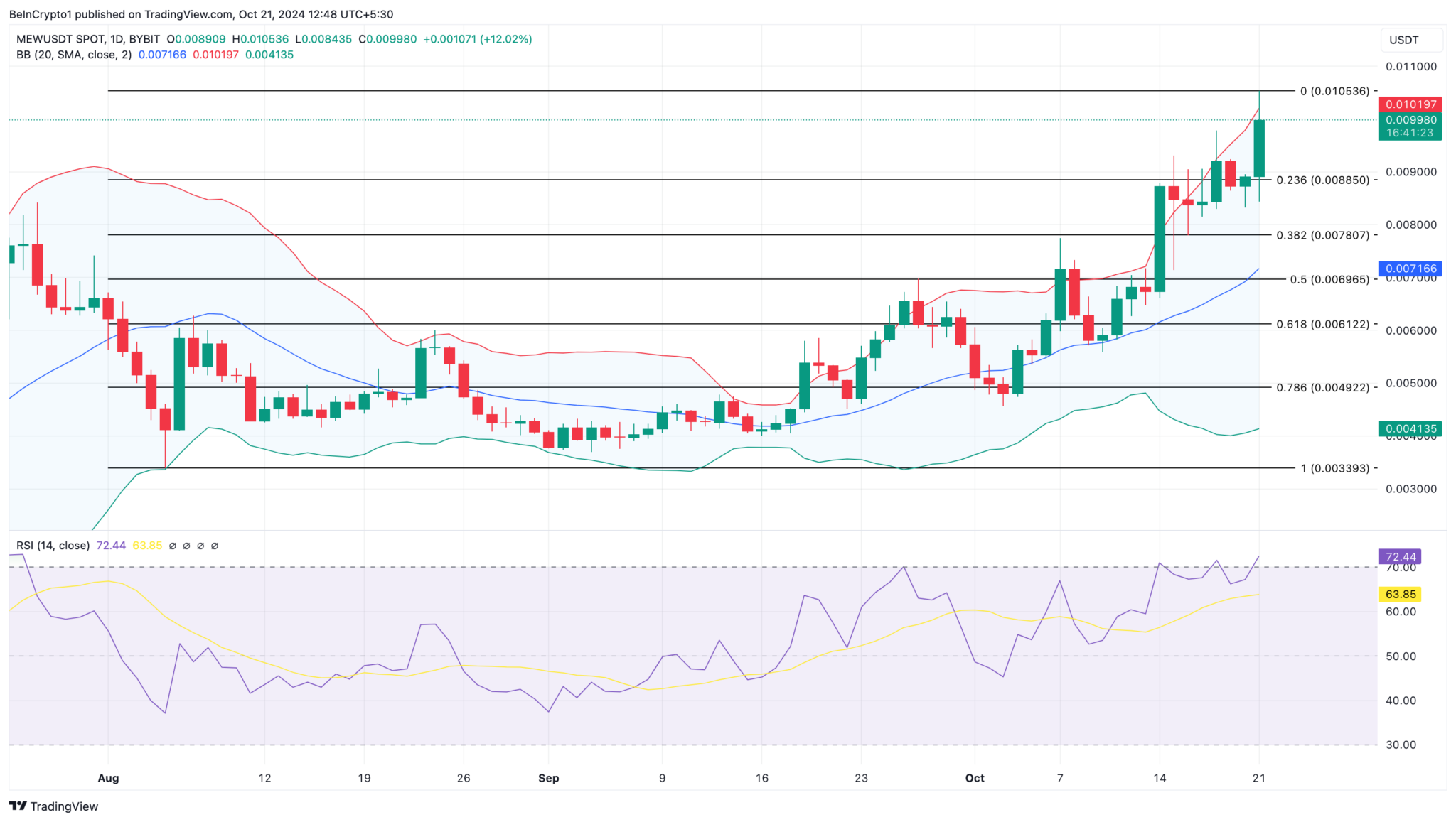 Antes desse desenvolvimento, o preço da MEW era de US$ 0,0089. Mas assim que a notícia se espalhou, a memecoin formou uma vela de engolfo de alta que a levou para US$ 0,010.