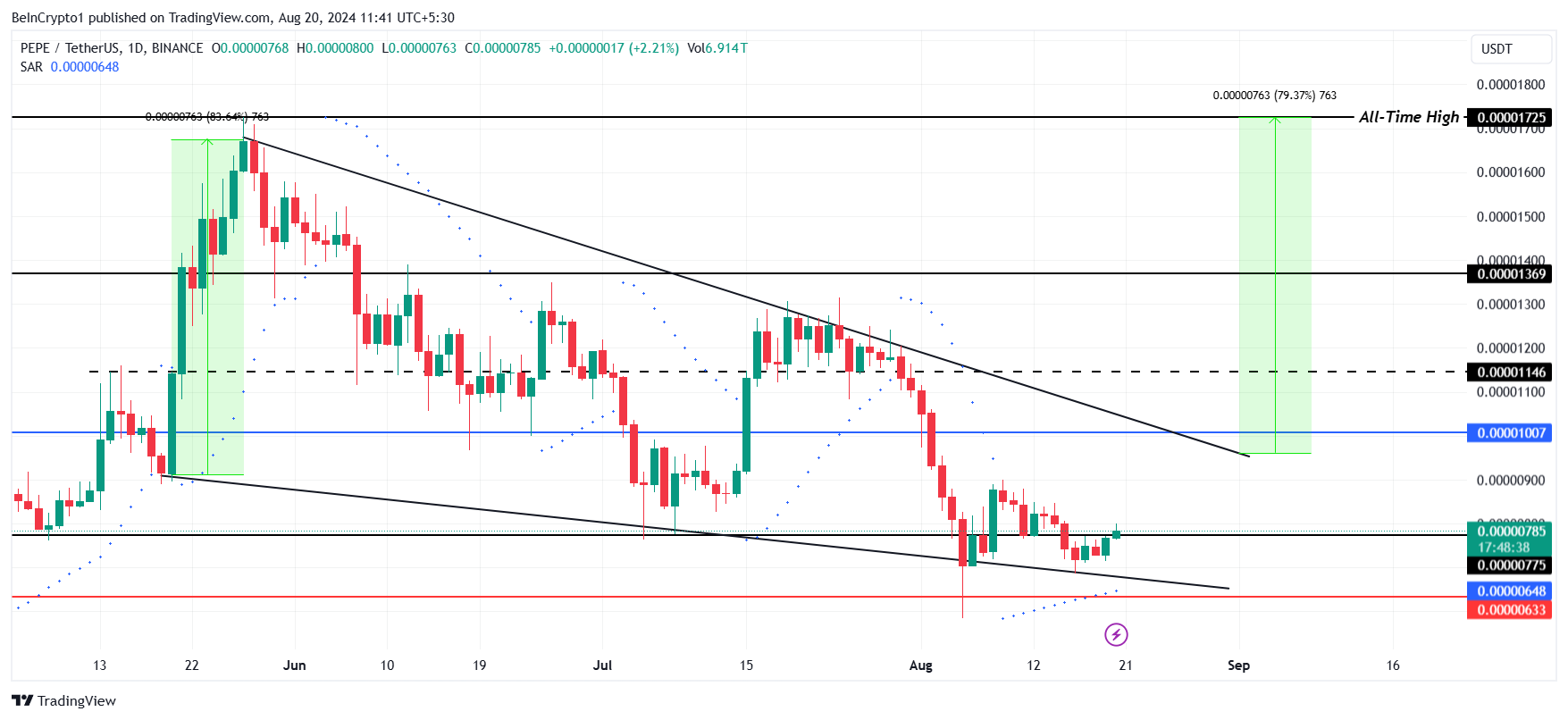 A PEPE está atualmente acima do suporte de US$ 0,00000775, procurando se recuperar desse nível para notar uma recuperação. A cunha de baixa em vigor apresenta um potencial de aumento de 80% em direção à máxima histórica de US$ 0,00001725.
