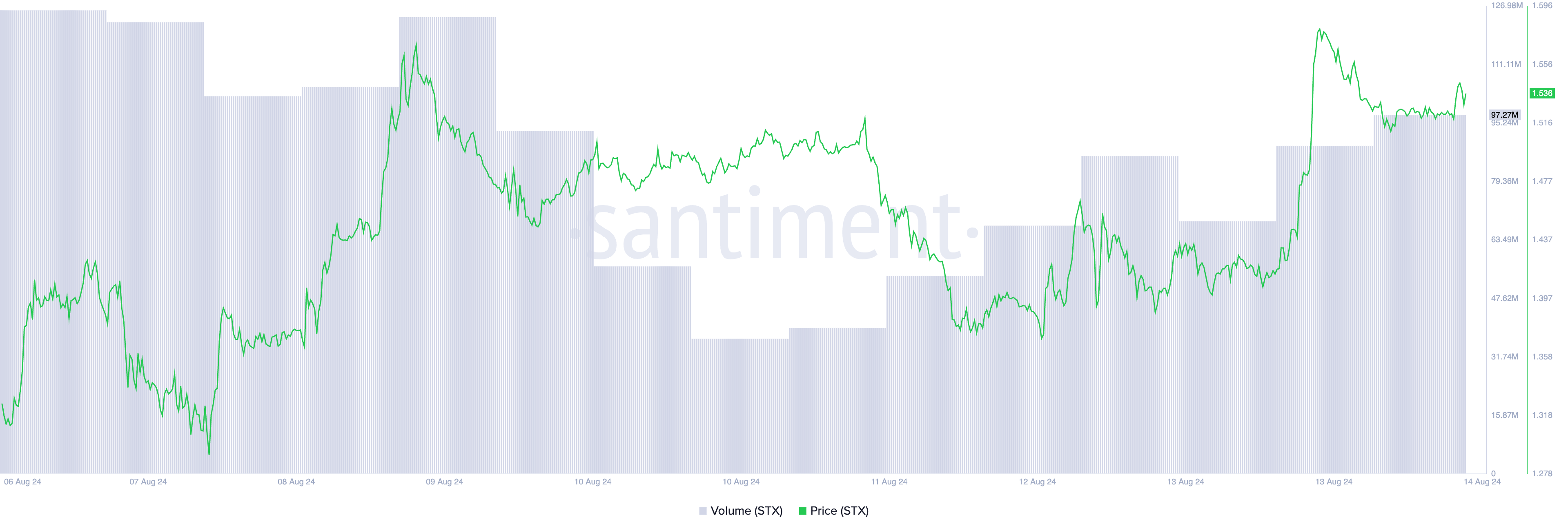 Atualmente, a STX é negociada a US$ 1,54, impulsionada por um aumento de preço de 8% nas últimas 24 horas. Essa recuperação é apoiada por um aumento de 31% no volume negociado, que atingiu US$ 97 milhões durante o mesmo período.