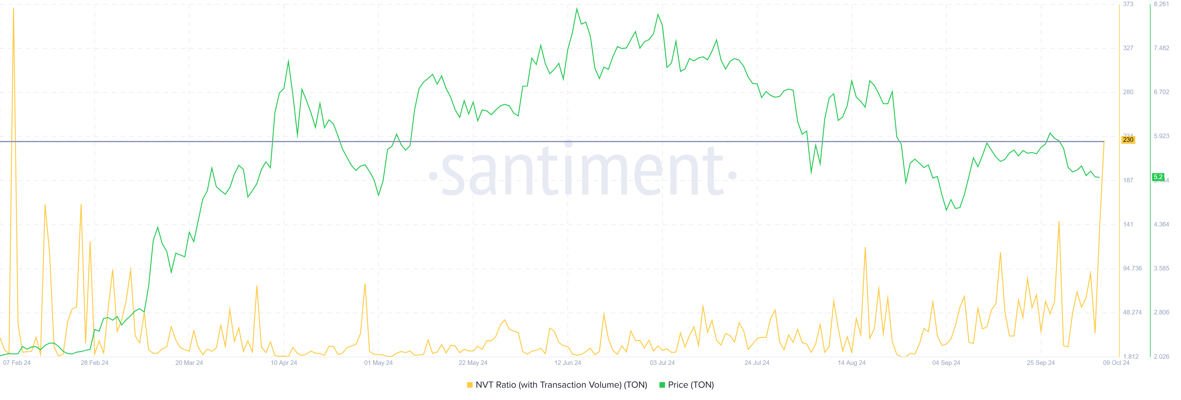 Atualmente, a Relação NVT para a TON está em um pico de sete meses, sugerindo que o valor da rede está inflado em comparação com sua atividade de transação.