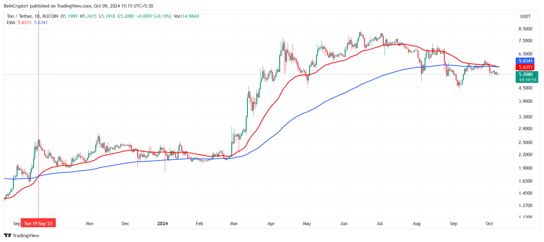 O sentimento pessimista intensificado já é evidente na ação de preço da Toncoin. Com as EMAs de 50 dias e 200 dias se alinhando para formar esse padrão, o potencial para uma queda significativa de preço está crescendo.