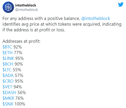 De acordo com dados da IntoTheBlock, 95% dos endereços ChainLink e Crypto.com estão atualmente em situação de lucro. Enquanto isso, 94% dos endereços da VeChain adquiriram suas participações a um preço mais baixo do que hoje.