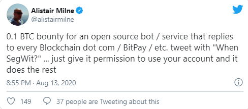 Na verdade, Milne recentemente colocou uma recompensa de 0,1 BTC pela criação de um bot que simplesmente postaria “Quando vai usar SegWit?” como uma resposta a tweets de empresas que não usam transações SegWit.