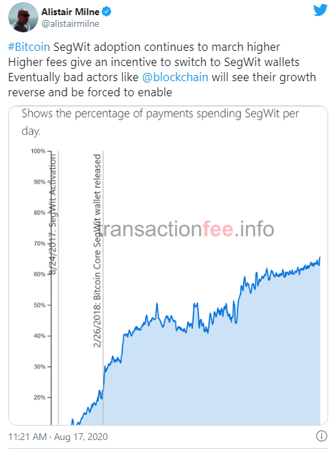 O investidor de criptomoedas e empresário Alistair Milne concorda com essa avaliação, citando dados da transactionfee.info. Na casa dos 65%, o número de transações que implementam a solução de escalabilidade atingiram a máxima de todos os tempos.