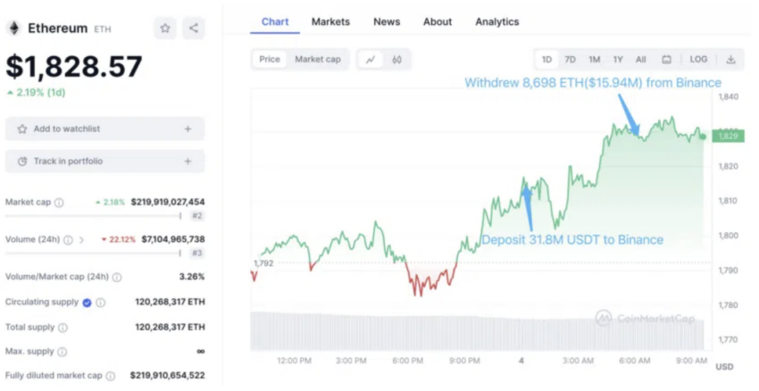 Este endereço enviou 24.495 ETH (US$ 45 milhões) para a Binance e aproveitou a alta de preços para obter um lucro de US$ 5,47 milhões. Dois dias depois, a baleia depositou 31,8 milhões de USDT na Binance e retirou 8.698 ETH (US$ 16 milhões) algumas horas depois.