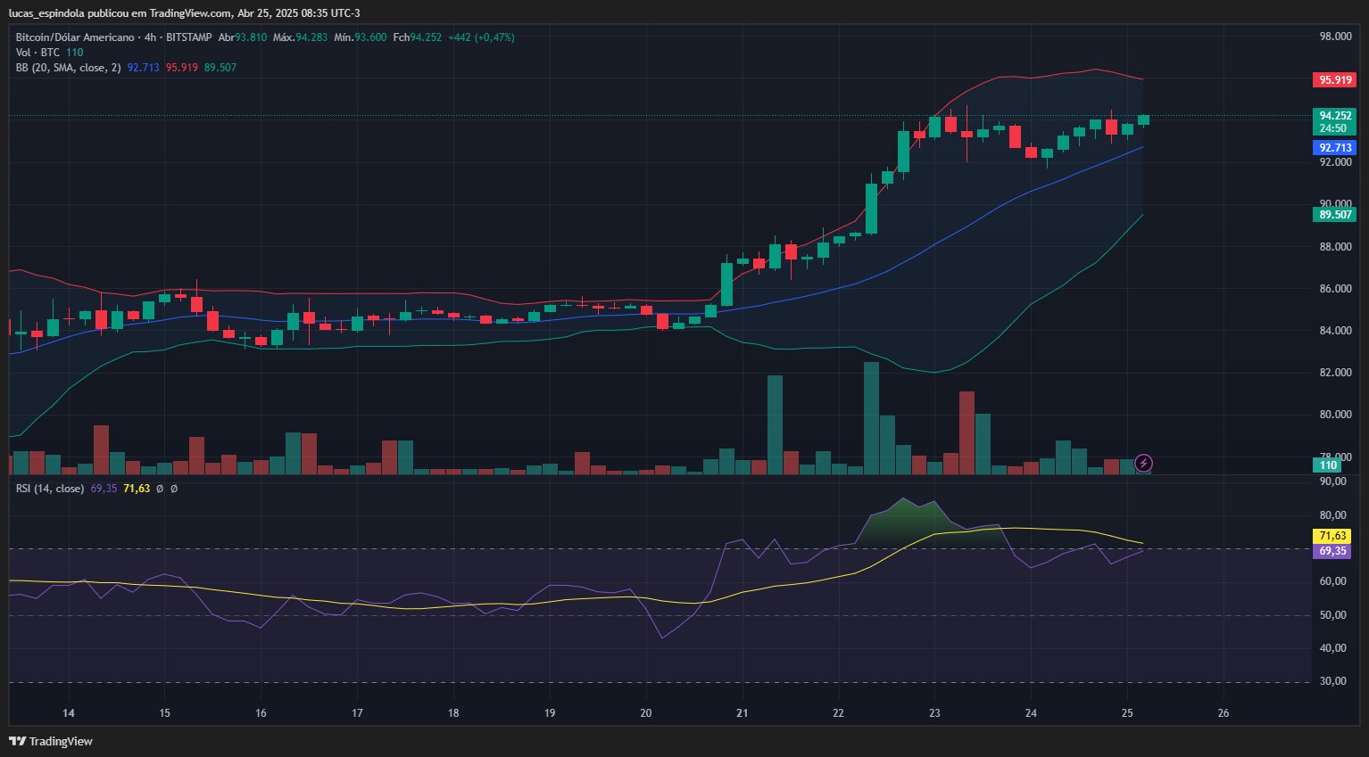 O Bitcoin (BTC) segue em alta nesta sexta-feira (25), mantendo o ritmo de valorização observado nos últimos dias. No gráfico de 4 horas, a criptomoeda é negociada a US$ 94.247, com variação positiva de 0,47% nas últimas horas. O BTC alcançou a máxima de US$ 94.249, enquanto a mínima ficou em US$ 93.600, mostrando força compradora, mas também encontrando obstáculos para avançar além da faixa atual.