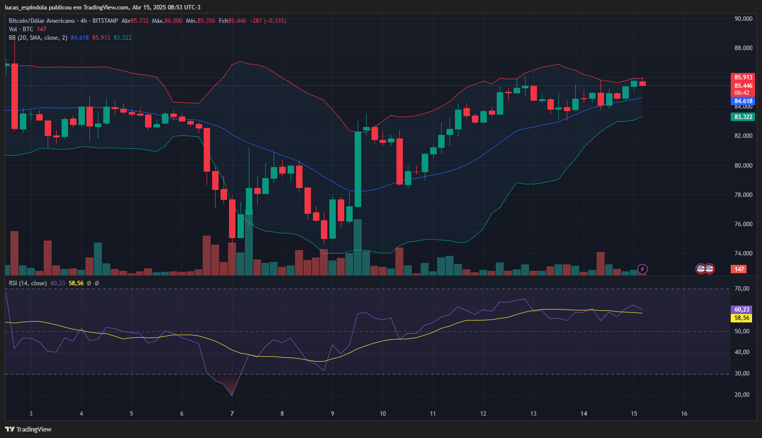 O gráfico de 4 horas mostra que o BTC enfrenta dificuldade para superar a região de resistência entre US$ 85.900 e US$ 86 mil. Essa faixa está próxima da banda superior das Bandas de Bollinger, o que reforça o obstáculo técnico. Caso o preço rompa esse nível com volume, pode haver uma aceleração da tendência de alta.