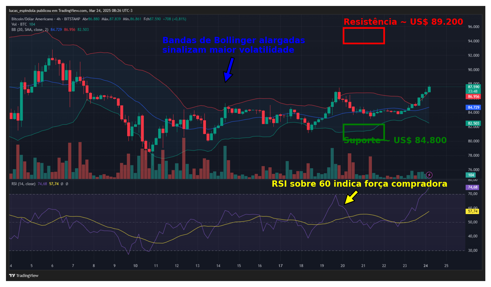O Índice de Força Relativa (RSI) está em 64,93, ainda abaixo da zona de sobrecompra, mas em uma inclinação positiva. Isso indica que os compradores seguem atuantes, embora o mercado ainda não esteja excessivamente aquecido. O RSI acima de 60 sugere uma tendência de curto prazo mais favorável ao movimento altista.
