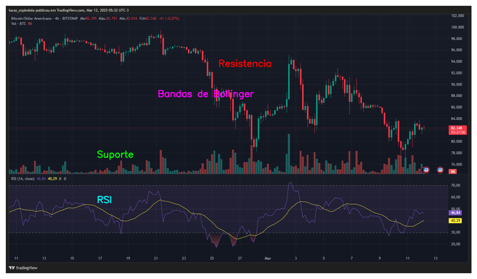 O Bitcoin continua movimentado no gráfico de 4 horas, com oscilações importantes que indicam momentos cruciais para os traders. O ativo testou níveis de suporte e resistência, enquanto indicadores técnicos, como o Índice de Força Relativa (RSI) e as Bandas de Bollinger, sugerem direções potenciais para o preço.
