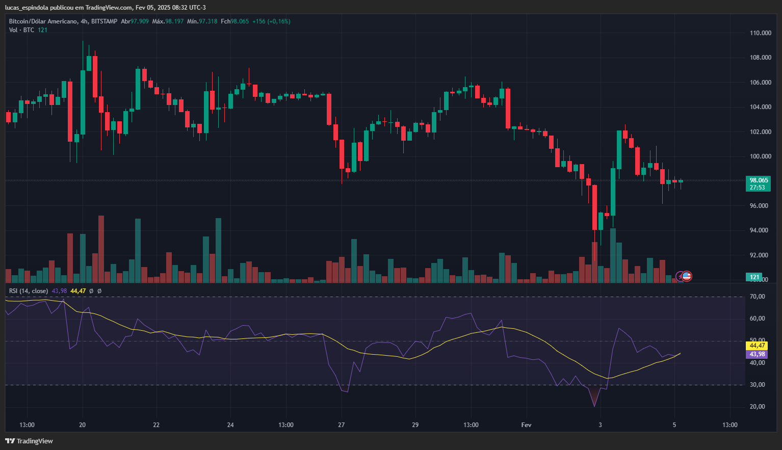 Após uma forte liquidação que levou o BTC a mínimas próximas de US$ 91 mil, o ativo se recupera e agora opera em US$ 97.948, registrando uma leve alta de 0,04%. O volume de negociação aumentou, indicando maior participação de compradores tentando sustentar o preço.