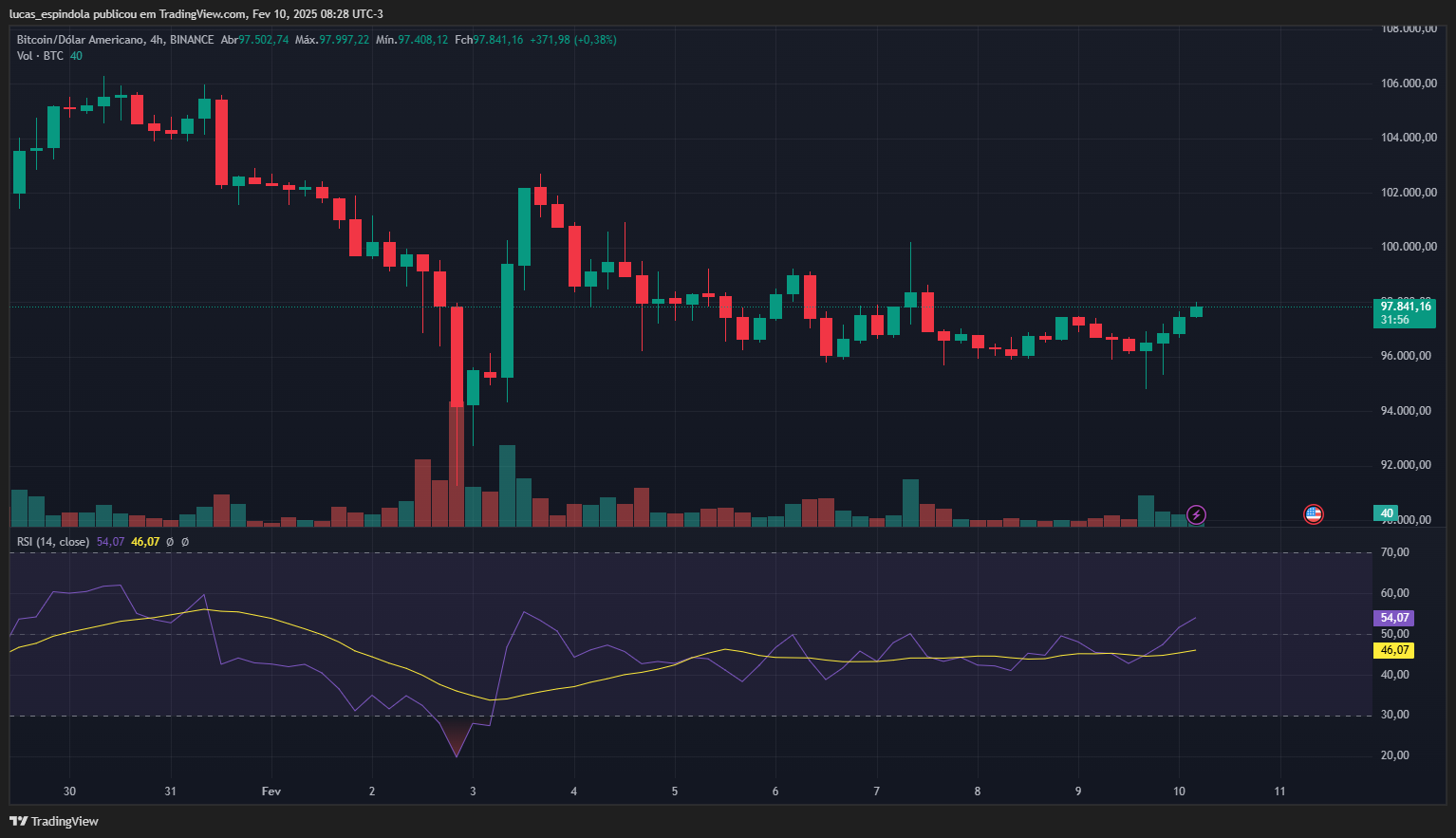 O Bitcoin (BTC) continua a apresentar movimentos significativos no mercado, influenciados por eventos globais recentes. No gráfico de 4 horas, observamos padrões que refletem essa volatilidade.
