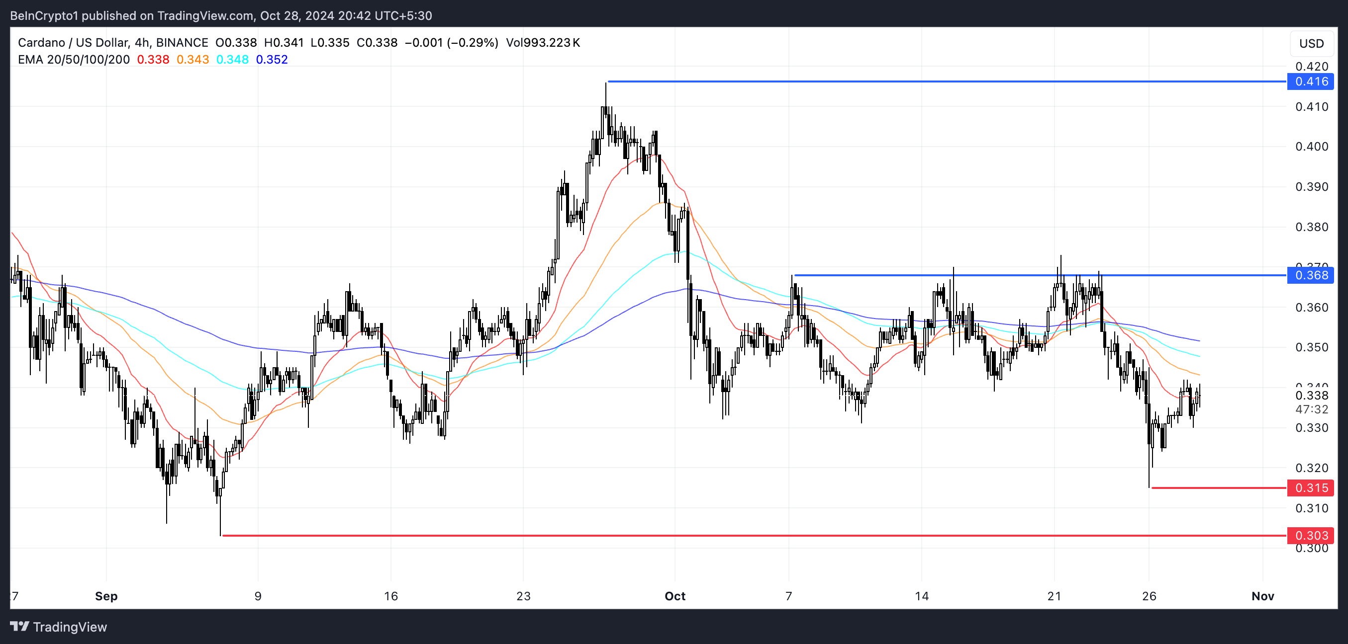Quanto às zonas de suporte e resistência, a resistência imediata é indicada em torno de US$ 0,36, conforme mostrado pela linha azul. Se essa for superada, o preço do ADA poderia subir para US$ 0,41, um crescimento potencial de 21%. A moeda mostra suporte em US$ 0,31 e US$ 0,30, destacados em vermelho. Se a tendência de baixa atual continuar e a Cardano testar US$ 0,30, isso significaria uma correção de preço potencial de 10%.