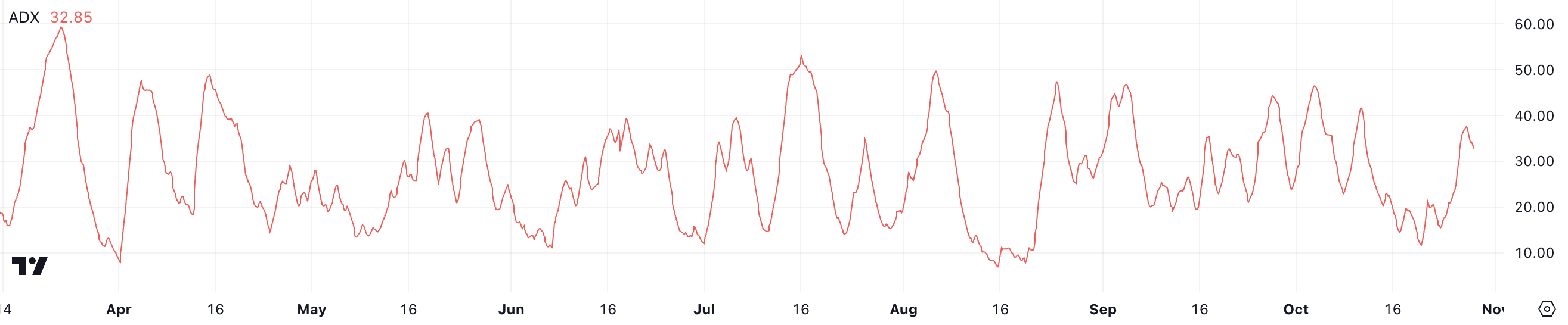 O ADX (Índice Direcional Médio) para ADA está atualmente em 32,85, marcando uma queda em relação ao valor anterior de 37, apenas um dia atrás. Essa queda indica que a força da tendência predominante de ADA enfraqueceu ligeiramente.