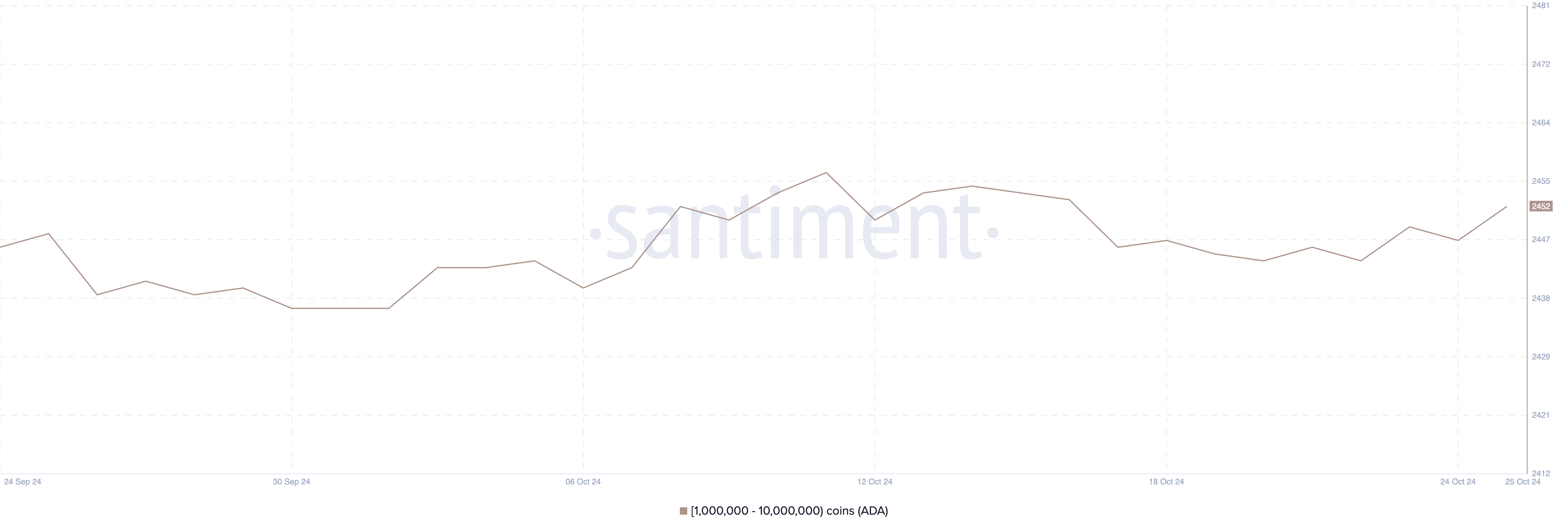 O número de endereços que possuem entre 1 milhão e 10 milhões de ADA permaneceu estável nos últimos dias. De 20 a 28 de outubro, esse número cresceu ligeiramente de 2.444 para 2.452.