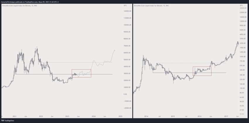 Nesse caso, o analista espera que o preço suba no final de 2023 ou início de 2024. Este cenário implica uma repetição dos padrões de movimentação vistos em 2016.