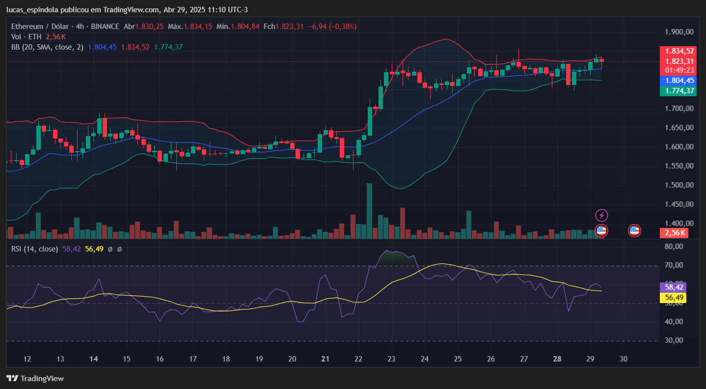 O Ethereum (ETH) registrou leve queda na manhã desta terça-feira (29), sendo negociado a US$ 1.815, com recuo de 0,78% nas últimas 4 horas. O gráfico de 4 horas mostra que o preço encontrou forte resistência próxima à faixa de US$ 1.833,60, onde passa a banda superior das Bandas de Bollinger.